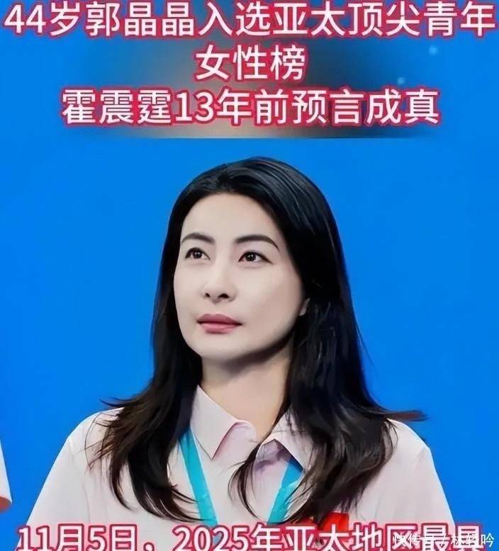 一则喜讯正式公布,直击富太太群体的“软肋”。 2025年11月5日,郭晶晶成功入选“亚太顶尖青年女性榜”。 这份榜单能引发霍家关注,本身就说明其非凡地位。 “亚太顶尖青年女性榜”由亚太青年领袖计划发起,覆盖APEC全部21个经济体。 仅面向45岁以下杰出女性,需通过“职业成就、社会贡献、国际影响力”三重严苛筛选,含金量极高,堪称全球青年才俊的“女性实力认证书”。