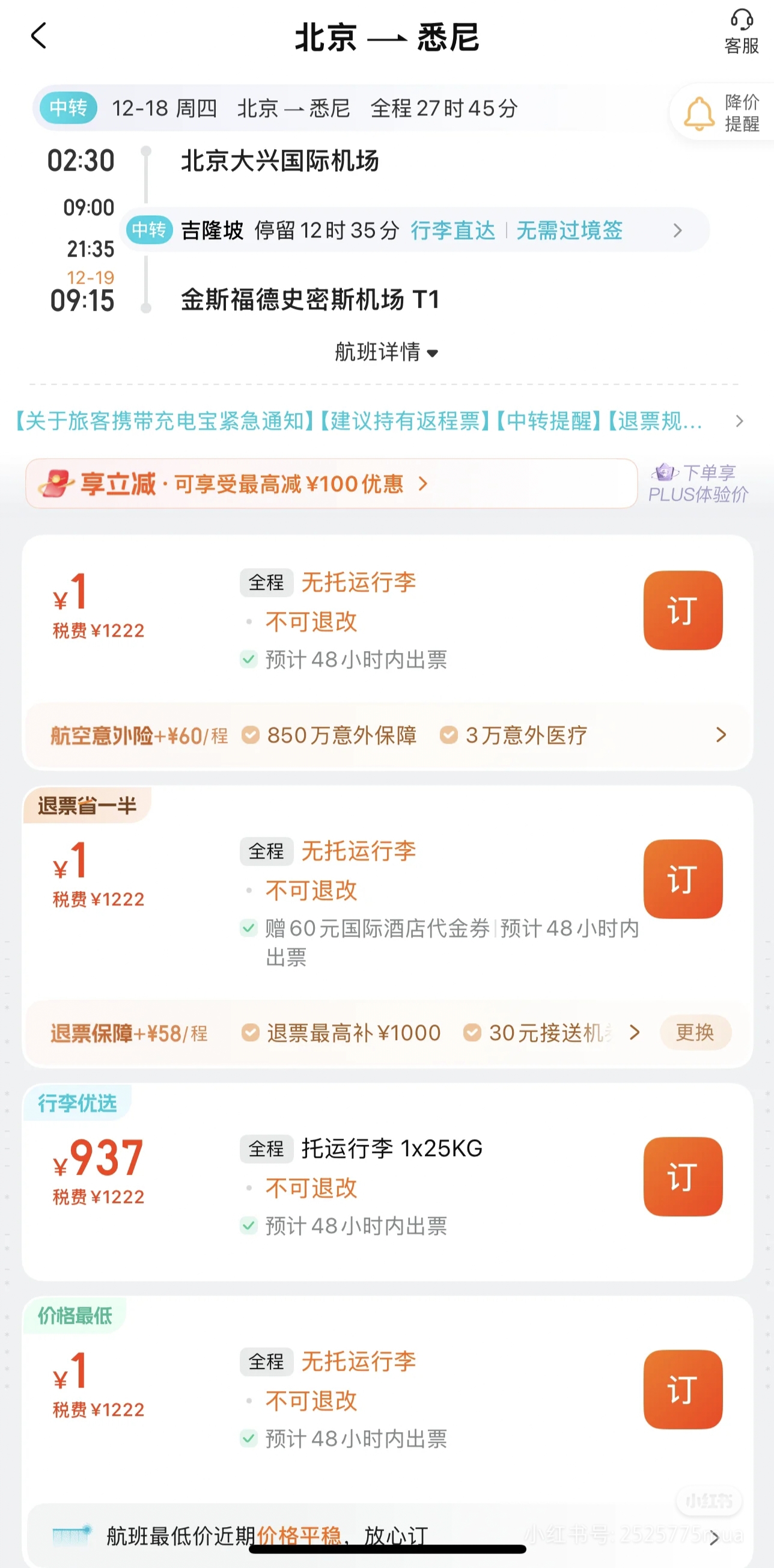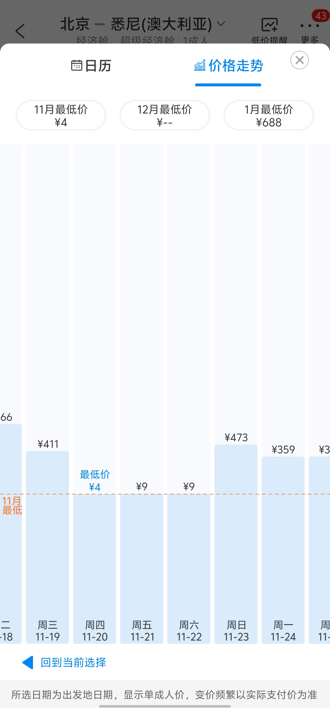 近日,一则“北京飞悉尼国际航班惊现-43元票价”的消息在社交平台迅速传播,引发广泛关注。11月11日,记者联系到同样关注此信息经常出国的常旅客董先生,他同样发了一条“1元机票”的帖子,引起网友围观。