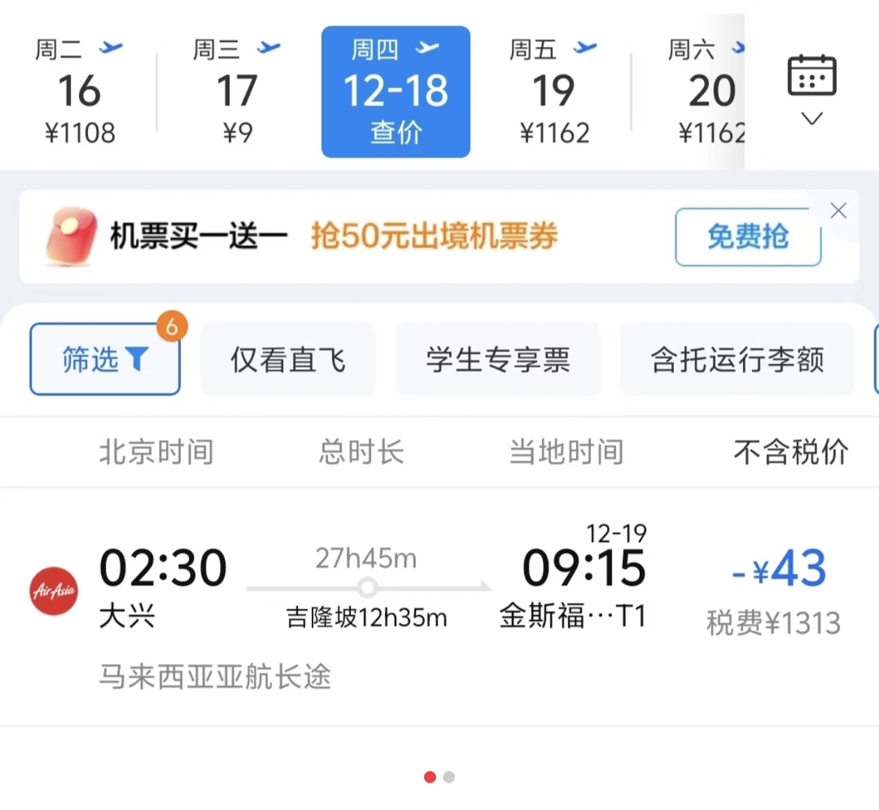 对此现象,航空业分析人士指出,所谓的“负票价”实则是一种营销噱头。这趟由马来西亚亚洲航空运营的航班,需在吉隆坡中转,全程耗时近28小时。所谓的-43元票价仅是不含税的基础价格,当用户勾选“不含税价”选项时才会显示。在结算页面,系统会自动加上高达1300元的税费,最终总价在1249元至1323元之间。