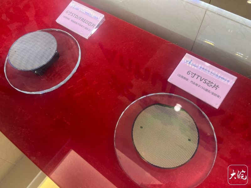 在一楼的产品展示区,记者看到这里展示不同的芯片。汽车电子芯片应用于汽车发电机、点火器等,超高压整流芯片应用于微波设备、智能电表、工业电源等。该公司常务副总经理张小明向记者介绍,公司成立于2012年10月,主要从事半导体芯片设计、晶圆制造、封装测试于一体的综合性半导体研发和制造。