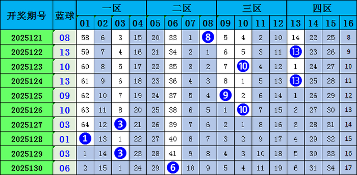 蓝球综合分析:上周四蓝球奖号为奇数号码01,最近7期蓝球号码分别开出13、09、10、03、01、03、06,质合比为4:3,质数蓝球走势相对较热,本期预计质数蓝球热出;上期蓝球开出小偶数号码06,近10期蓝球奇偶比为6:4,近5期奇偶比为3:2。本期蓝球重点关注一码:07。