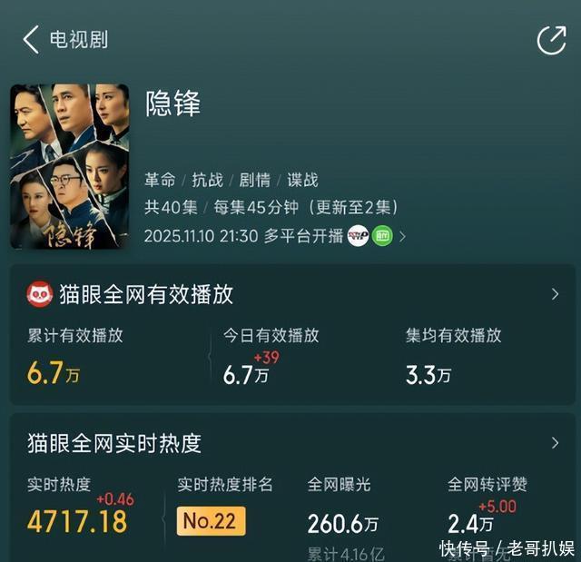 先是网播成绩彻底翻车。 虽然有央视坐镇,收视率轻松破1,但在网播上,《隐峰》上线后甚至连热播榜前十都没挤进去,直接被甩在20名开外。 而两天的播放量,竟然只有凄凄惨惨的6.7万。 可以说是惨到家了。