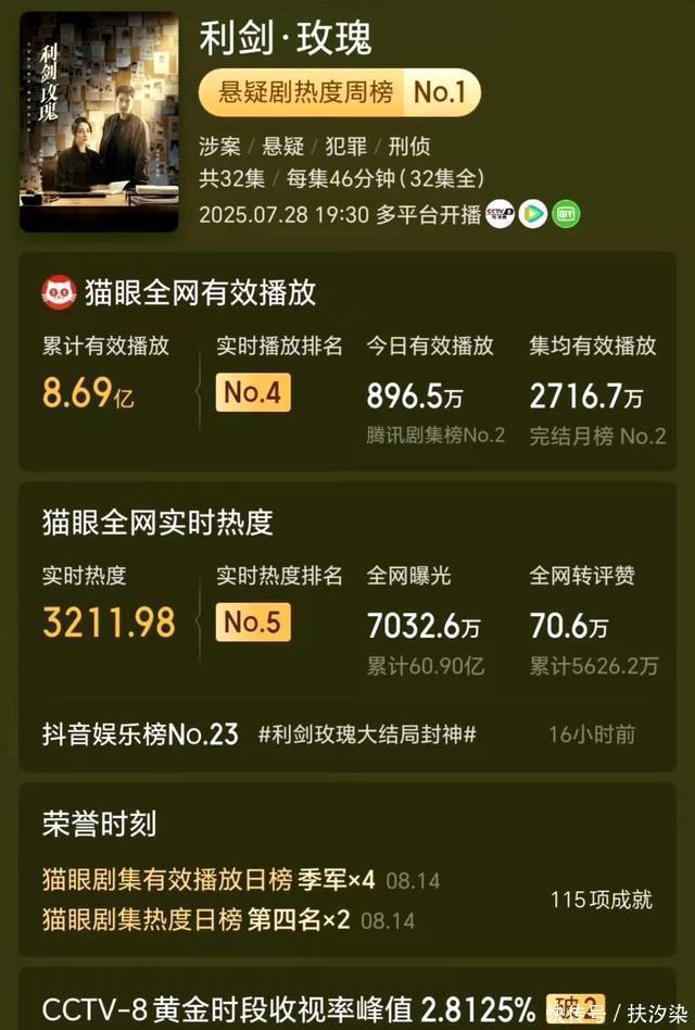 该剧开播即爆,17分钟登顶全网收视榜,央视实时收视率峰值突破3.27%,创下年代剧的收视佳绩。云合数据单日播放量最高达3400万,市占率一度登顶。 豆瓣7.5分 是杨幂近年来的作品高分。观众反馈尤其积极,不少人为宁绣绣的成长线动容,剧中“把日子过出花”等金句也成功出圈,引发了关于女性命运与土地情怀的广泛讨论。 迪丽热巴《利剑·玫瑰》:打拐题材下的现实主义力作